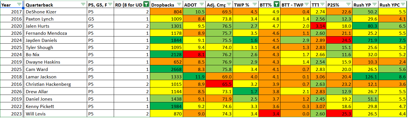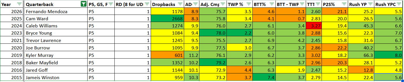 Here’s Mendoza on the main page of The Spreadsheet against the other 1st overall picks I have data for. The colors aren’t just how these guys compare to each other but how they stack up against all 140 other guys in there. Compared to the average draft-eligible quarterback and the average top pick Mendoza is quite conservative, with an ADOT of just 8.9 yards. His accuracy is as advertised, with an adjusted completion % in the top third of all QBs since 2014, but I do think that has a bit of a caveat when you consider the low ADOT. Overall though you can see that Mendoza looks fairly less impressive than the kind of quarterback we usually see go at the top of the draft, with the exception of last year’s first overall pick, Cam Ward. Ward is about the least useful comp imaginable, though, since after a thoroughly Meh rookie year on a truly awful team I don’t think we have any idea yet what kind of NFL quarterback he’s actually going to be.