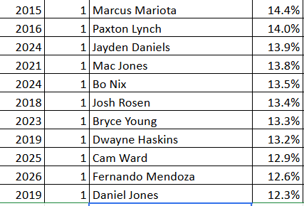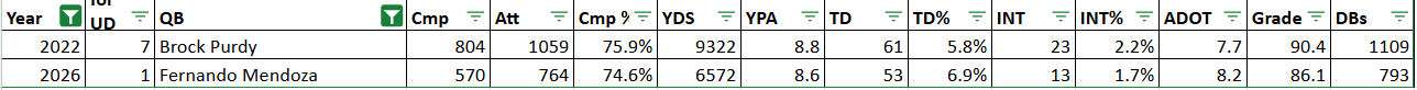 Another thing I like to look at is a quarterback’s clean pocket numbers, since it can help to filter out some noise caused by bad situations (again, Mahomes at Texas Tech). Mendoza’s closest comp in clean pocket situations is fairly encouraging as well given that he’s also going to be the point man in a Shanahan system under Klint Kubiak: